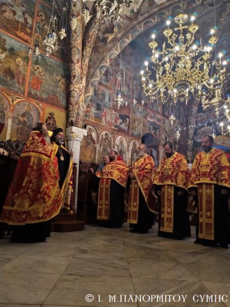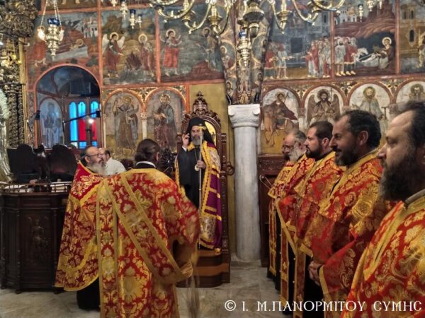 Σήμερα, κυριώνυμον ημέρα της εορτής, χοροστατούντος του Σεβασμιωτάτου Μητροπολίτου Σύμης, Τήλου-Χάλκης και Καστελλορίζου κ. Χρυσοστόμου ετελέσθη ο Όρθρος και η Θεία Λειτουργία, συλλειτουργούντων του Καθηγουμένου της Ι. Μονής Αρχιμ. Αντωνίου Πατρού, του φιλοξενουμένου Αρχιμ. Ιωαννικίου Αναγνώστου, του Οικον. Αντωνίου Κασιώτη και του Διακόνου μας Γεωργίου Κακακιού.