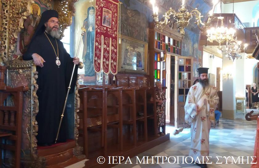 Τὴν Κυριακή 18η Αὐγούστου 2019, ὁ Σεβ. Μητροπολίτης μας κ Χρυσόστομος χοροστάτησε στὸν Ὅρθρο καί τέλεσε τήν Θεία Λειτουργία στόν Ἱ.Ἑνοριακό Ναό Τιμίου Σταυροῦ τοῦ Χωριοῦ στήν Σύμη, μέ συλλειτουργούς, τόν Ἐφημέριο τοῦ Ἁγίου Ἐλευθερίου π Δημήτριο Γεωργιάδη καί τόν Διάκονό του π. Γεώργιο Κακακιό.