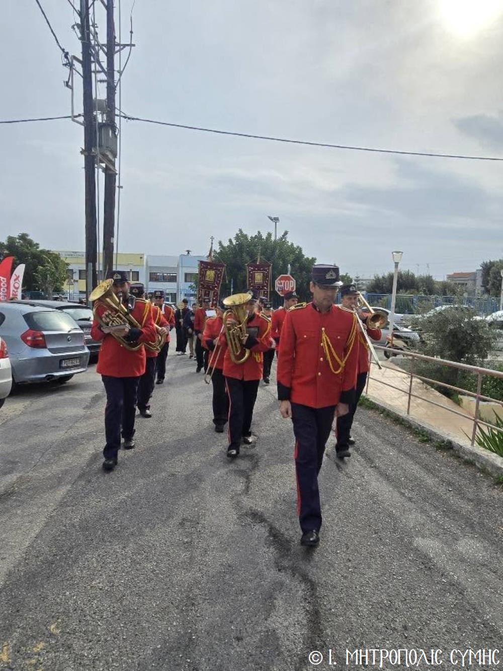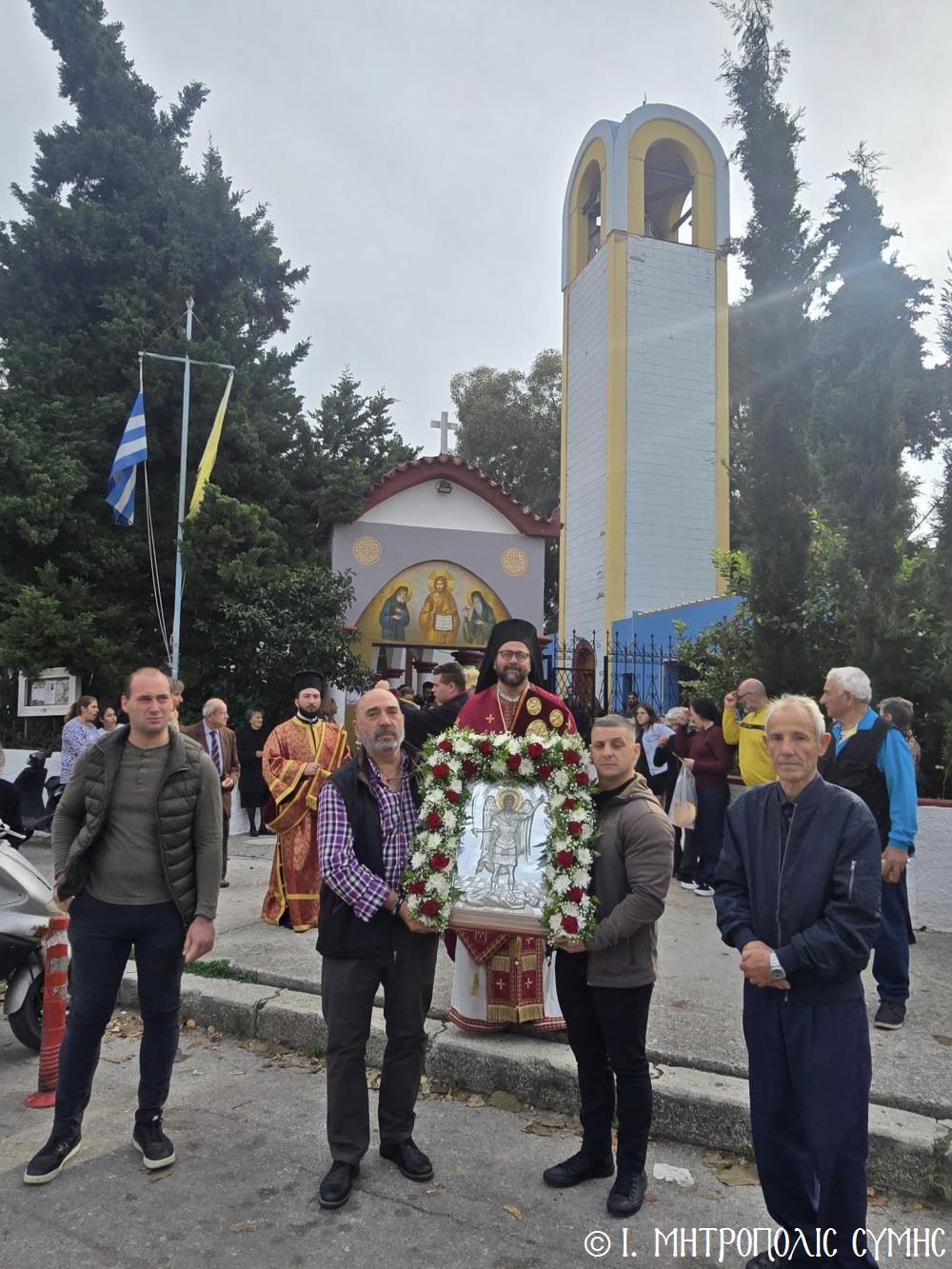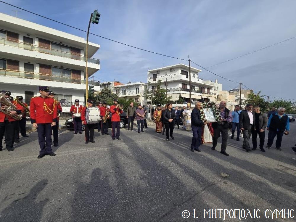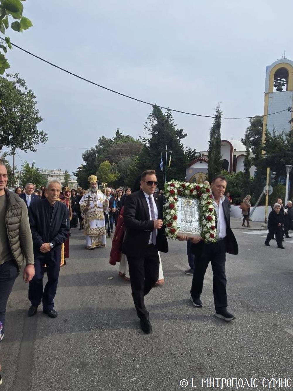 Σήμερα το πρωί, Κυριακή 23η Νοεμβρίου, ο Σεβ. Μητροπολίτης Σύμης κ. Χρυσόστομος, κανονική αδεία και προτροπή του οικείου Σεβ. Μητροπολίτου Ρόδου κ. Κυρίλλου, χοροστάτησε εις τον Όρθρο και τέλεσε την Θεία Λειτουργία στον Ενοριακό Ιερό Ναό Αναλήψεως του Σωτήρος πόλεως Ρόδου, ευλόγησε την προσφερομένη Αρτοκλασία του Συλλόγου, ενώ στο τέλος προέστη της λαμπράς Λιτανείας, πέριξ του Ι. Ναού, της Εικόνας του Ταξιάρχου Μιχαήλ του Πανορμίτου, αντιγράφου της πρωτοτύπου, που φυλάσσεται προς ευλογία των Μελών του Συλλόγου στο «Συμιακό σπίτι». Συλλειτούργησαν, ο Πανοσιολ. Αρχιμανδρίτης π. Ιωαννίκιος Αναγνώστου, Ιερατικώς Προϊστάμενος της Ενορίας και ο Ιεροδιάκονος Παύλος Τερεζάκης, ενώ συμπροσευχόμενος από του Ιερού Βήματος παρέστη και ο Σεβ. Μητροπολίτης Νουβίας κ. Σάββας.