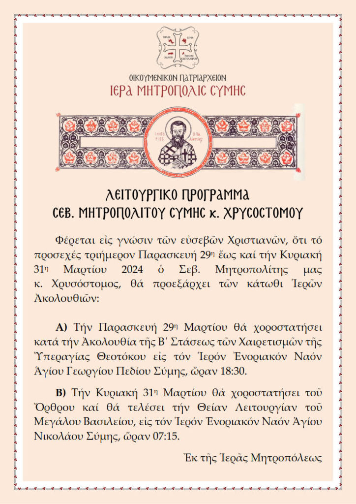 Β) Την Κυριακή 31η Μαρτίου θα χοροστατήσει του Όρθρου και θα τελέσει την Θεία Λειτουργία του Μεγάλου Βασιλείου, στον Ιερό Ενοριακό Ναό Αγίου Νικολάου Σύμης, στις 07:15.