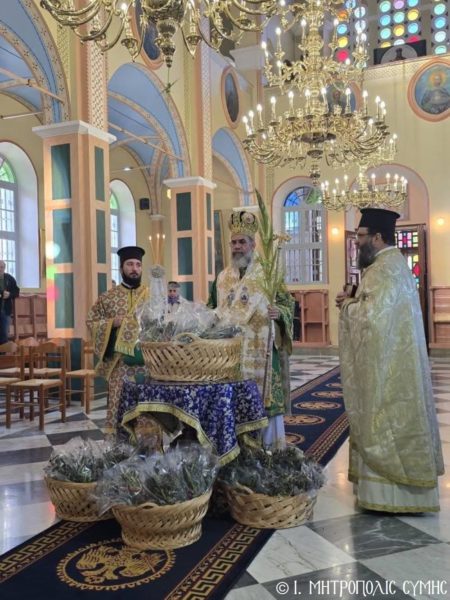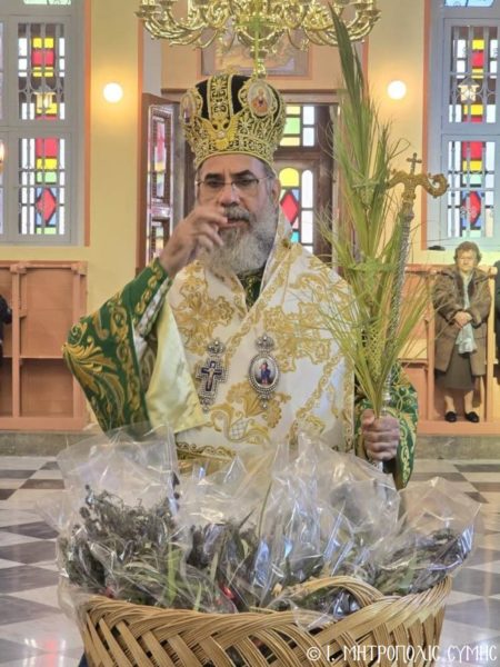 Τα ι. αναλόγια διακόνησαν οι Ιεροψάλτες κ. Πανορμίτης Κακακιός, κ. Δημήτριος Κοπανίδης, κ. Ελευθέριος Ξηράκης και κ. Μιχαήλ Κυπριώτης. Προ των Αίνων, κατά την διατεταγμένη τάξη, ο Σεβασμιώτατος ανέγνωσε την δοξολογική ευχή επί των παρατιθεμένων βαίων της Εορτής, τα οποία διένειμε στο πολυπληθές εκκλησίασμα, για να καταδειχθεί ότι κρατώντας οι πιστοί τα βαία, συμμετέχουμε στην μεγαλειώδη και θριαμβευτική είσοδο του Κυρίου μας στην αγία Πόλη, υποδεχόμενοι Αυτόν ως Νικητή του θανάτου και του Άδου, ως θριαμβευτή Βασιλέα, όχι βέβαια κοσμικό, όπως τον περίμεναν οι Ιουδαίοι, αλλά ως αιώνιο πνευματικό Άνακτα. «…ημάς, τους κατά μίμησιν εκείνων, τη προεορτίω ταύτη ημέρα Βαΐα και κλάδους δένδρων εν χερσί φέροντας, διατήρησον, και ως εκείνοι οι όχλοι και οι Παίδες, το Ωσαννά σοι προσφέροντας, διαφύλαξον, όπως εν ύμνοις και ωδαίς πνευματικαίς καταξιωθώμεν της ζωοποιού και τριημέρου Αναστάσεως».