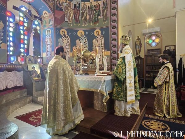 Ο Σεβ. Μητροπολίτης Σύμης, Τήλου, Χάλκης και Καστελλορίζου κ. Χρυσόστομος χοροστάτησε σήμερα στον Όρθρο και τέλεσε την Θεία Λειτουργία στον Ενοριακό Ιερό Ναό της Αγίας Τριάδος Σύμης, με συλλειτουργούς του τον Εφημέριο του Ναού π. Γεώργιο Χατζηχρυσάφη και τον Ιεροδιάκονο π. Παύλο Τερεζάκη.