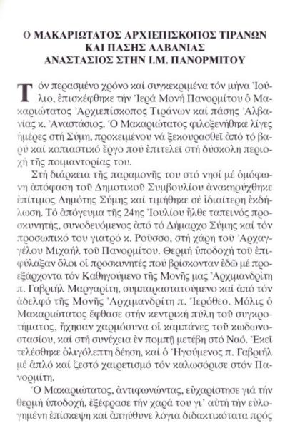 Ο Σεβασμιώτατος μετά την Δοξολογία τέλεσε τον Αγιασμό επί τη ενάρξει του νέου μηνός Μαρτίου, ενώ μετά την Απόλυσιν της Θείας Λειτουργίας προέστη του Ιερού Μνημοσύνου επί τη συμπληρώσει τεσσαράκοντα ημερών από της προς Κύριον εκδημίας του μακαριστού Αρχιεπισκόπου Τιράνων, Δυρραχίου και πάσης Αλβανίας κυρού Αναστασίου, ο οποίος συνεδέετο με την Σύμη, καθ’ ότι επεσκέφθη το θέρος του 2001 επί ημέρες την Νήσον μας ως ταπεινός προσκυνητής και ιδίως τα εν αυτή εννέα Προσκυνήματα του Ταξιάρχου Μιχαήλ.