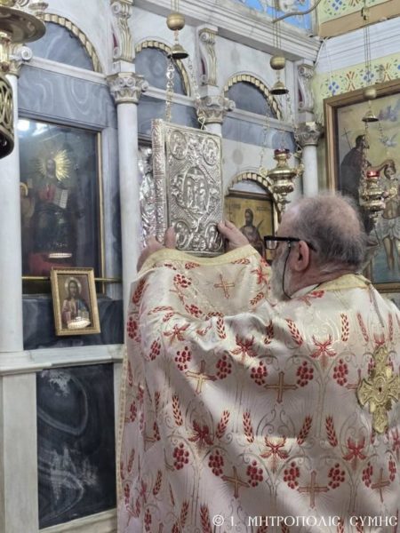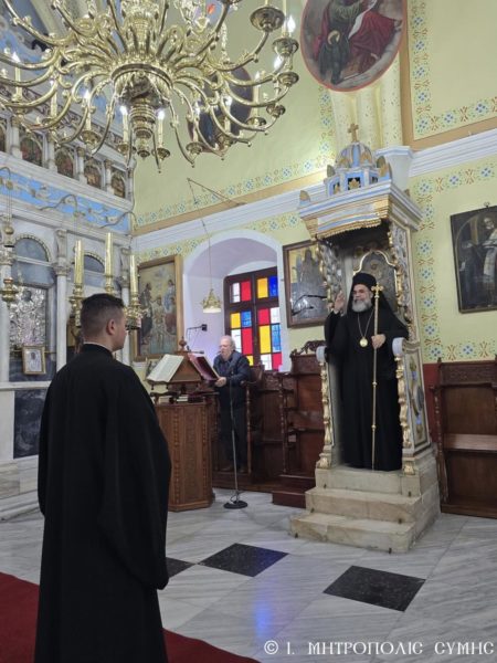 Ο Σεβασμιώτατος απευθυνόμενος προς τους εκκλησιαζομένους πιστούς, με τον μεστό θεολογικό του λόγο, ομίλησε λαμβάνοντας αφορμή από το σημερινό ευαγγελικό ανάγνωσμα της Α΄ Κυριακής του Τριωδίου, αυτό της παραβολής του Τελώνου και του Φαρισαίου, αναφερόμενος πρωτίστως στην αρετή της ταπεινώσεως, αλλά και στην σήμερα αρξαμένη, ψυχωφελή περίοδο του Τριωδίου.