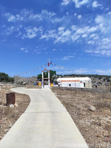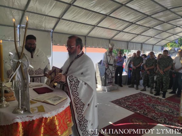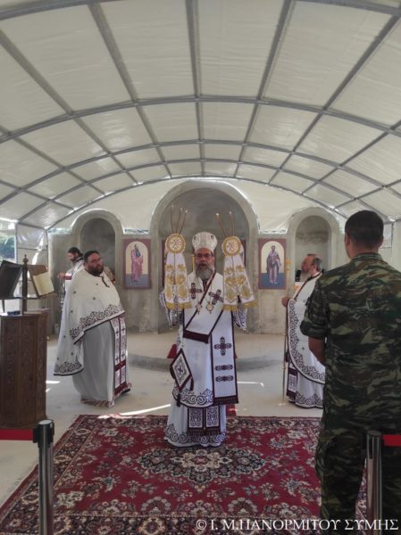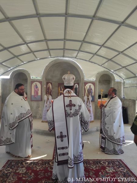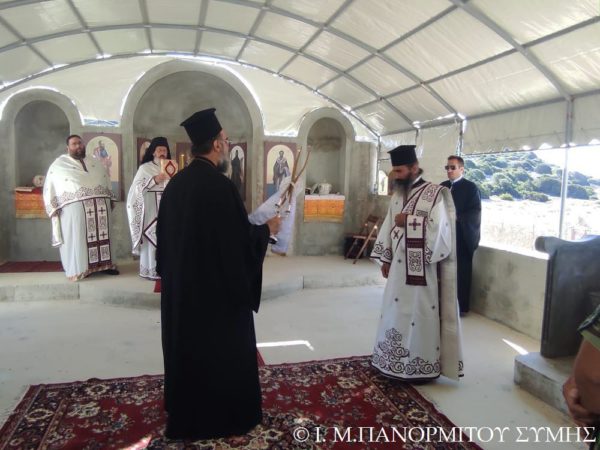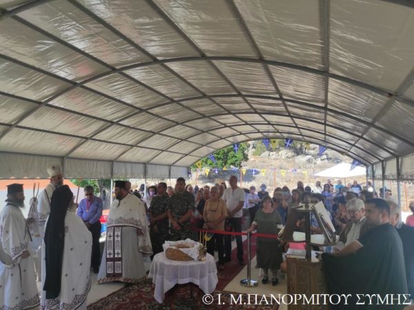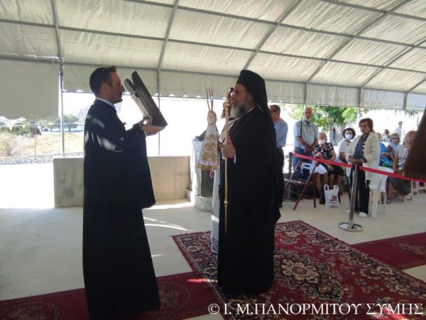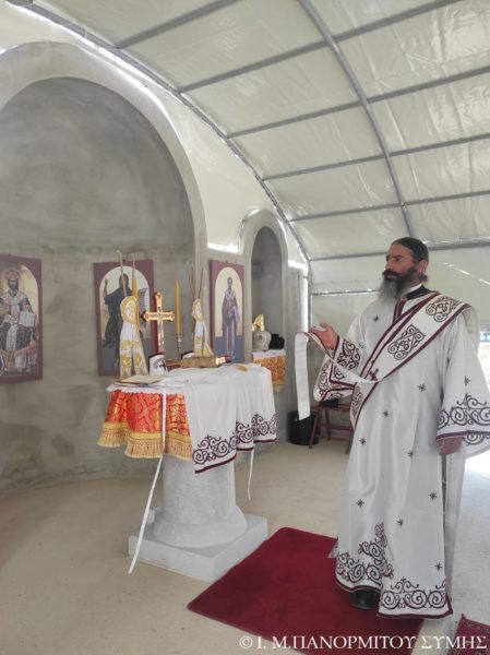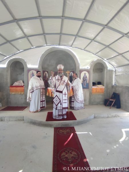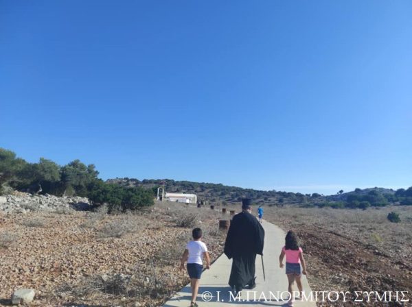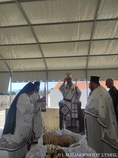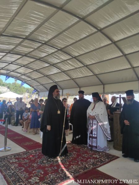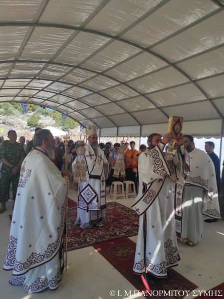 Ο Μητροπολίτης Σύμης κ. Χρυσόστομος χοροστάτησε του Όρθρου και τέλεσε την Θεία Λειτουργία στον χώρο του Ι. Βήματος του Αποστόλου Παύλου, έξωθεν του μικρού αυτού Ναού, με συλλειτουργούς του τον Πανοσιολ. Καθηγούμενο της κυριάρχου Ι. Μονής Πανορμίτου Αρχιμανδρίτη του Οικουμ. Θρόνου π. Αντώνιο Πατρό, τον Πανοσιολ. Αρχιμ. π. Ιωαννίκιο Αναγνώστου φιλοξενούμενο κληρικό εκ της Ι. Μητροπόλεως Ρόδου και τον Διάκονο π. Γεώργιο Κακακιό. Την ιερά υμνωδία ανέμελψαν γλυκυφθόγγως ο Αναγνώστης κ. Μερκούριος Γιανναράς Πρωτοψάλτης της Ι. Μονής, ο κ. Δημοσθένης Γιανναράς και ο κ. Δημήτριος Κοπανίδης μεθ’ ετέρων.