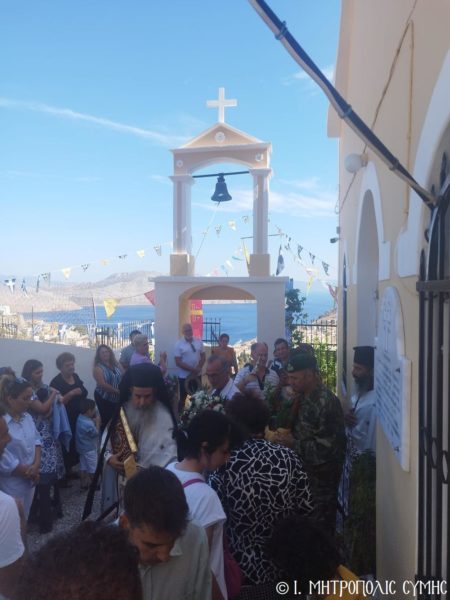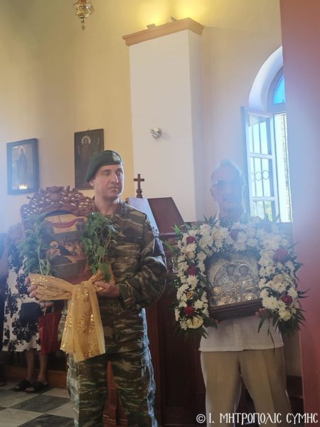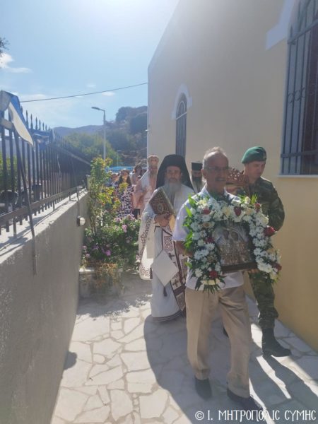 Τέλος πραγματοποιήθηκε λιτανεία της Χαριτοβρύτου Εικόνας της Παναγίας πέριξ του Ι. Ναού, ο οποίος αναφέρεται ότι θεμελιώθηκε το έτος 1966, μερίμνη της ευλαβούς Συμαίας Φωτεινής Κακακιού, προκειμένου να ενθρονισθεί εντός η θαυματουργή αυτή εικόνα της Παναγίας βρεφοκρατούσας, την οποία η μακαριστή πλέον, γερόντισσα είχε στην κατοχή της ως πατρογονικό ιερό κειμήλιο. Λόγω των δυσχερών ιστορικών συγκυριών της ιταλοκρατίας και του πολέμου, η εικόνα είχε μεταφερθεί για κάποια χρόνια στον Πειραιά και όταν επαναπατρίστηκε στην Σύμη, απέκτησε την προσωνυμία «Πειραιώτισσα».