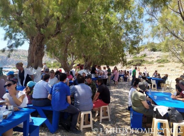 Μετά το πέρας της Θείας Λειτουργίας προσεφέρθησαν σ’ όλους τους εκκλησιασθέντες πιστούς τα πατροπαράδοτα κεράσματα και εν συνεχεία η Μονή παρέθεσε εόρτιο γεύμα σ’ όλους τους πανηγυριστές, στο οποίο παρεκάθισε και ευλόγησε, ο Σεβ. Μητροπολίτης κ. Χρυσόστομος κάτω απ’ τα σκιερά δέντρα της παραλίας, ώστε το κλίμα της πνευματικής χαράς και ευφροσύνης, να επισφραγισθεί και με την υλική τράπεζα της αγάπης, μια ακόμα ευλογημένη εκκλησιαστική ευκαιρία διαπροσωπικής επικοινωνίας και επαφής των ανθρώπων.