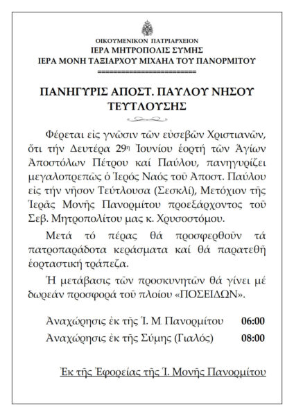 26/06/2020 26/06/2020 Το πανηγύρι των Αγίων Αποστόλων Πέτρου και Παύλου στο νησί Σεσκλί της Σύμης θα πραγματοποιηθεί την Δευτέρα 29 Ιουνίου στον Ιερό Ναό του Αποστόλου Παύλου που πανηγυρίζει και είναι Μετόχι της Ιεράς Μονής Πανορμίτου ενώ κατά την Θεία Λειτουργία θα προεξάρχει ο Σεβασμιώτατος Μητροπολίτης Σύμης κ. Χρυσόστομος.  Δείτε τη σχετική ανακοίνωση: