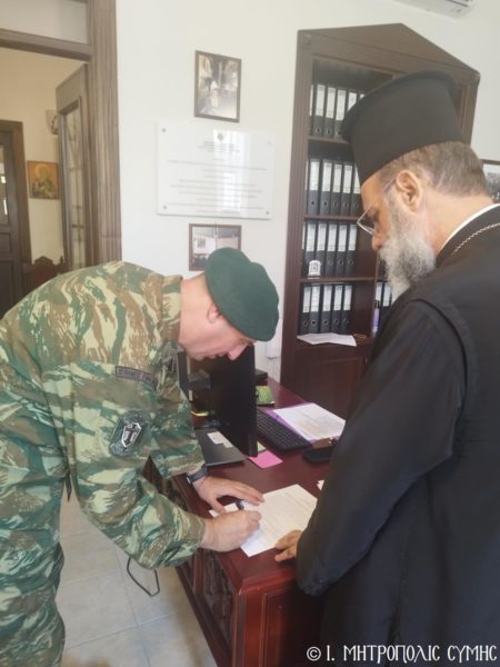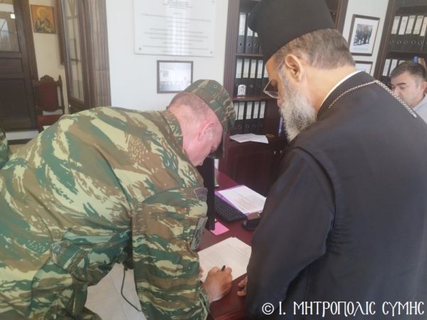 O Μητροπολίτης Σύμης, Τήλου, Χάλκης και Καστελλορίζου κ. Χρυσόστομος, παρέδωσε χθες, στα Γραφεία της Ιεράς Μητροπόλεως, είδη σύγχρονου ιατρικού εξοπλισμού στον Στρατιωτικό Διοικητή της Δ.Α.Ν. Σύμης, Συνταγματάρχη κ. Γεώργιο Ζιώγα, τον Διοικητή του 549 Τ.Ε. Σύμης, Αντισυνταγματάρχη κ. Στυλιανό Φωκά και τον Στρατιωτικό Ιατρό κ. Κωνσταντίνο Αγγελόπουλο, Ανθυπίατρο, τα οποία με την προσωπική διαμεσολάβηση του Σεβασμιωτάτου, κατόπιν αιτήματος προς αυτόν του Ανθυπιάτρου, απέστειλε το γνωστό «Διαγνωστικό και Θεραπευτικό Κέντρο Αθηνών ΥΓΕΙΑ Μ.Α.Ε.».