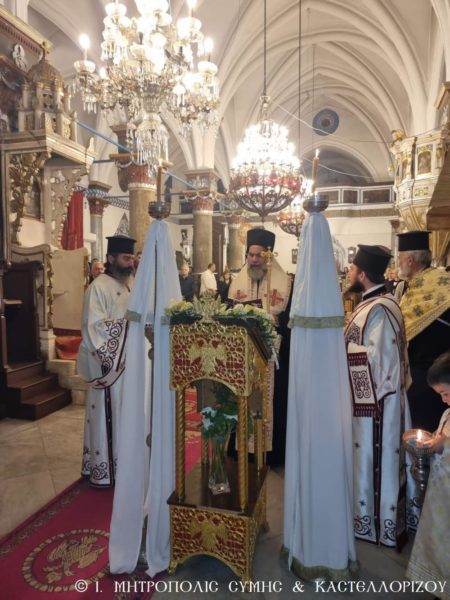 Μετά την απόλυσιν της Θείας Λειτουργίας, προέστη στην πανηγυρική δοξολογία του εορτασμού της 75ης επετείου από της ενσωματώσεως των Δωδεκανήσων στην Μητέρα Ελλάδα. Παρόντες όλοι οι εκπρόσωποι των τοπικών Αρχών, με επικεφαλής τον Δήμαρχο Μεγίστης κ. Γεώργιο Σαμψάκο και τα Μέλη του Δημοτικού Συμβουλίου. Παρέστησαν ακόμη, ο Διοικητής της Δ.Α.Ν. Μεγίστης, Αξιωματικοί και Υπαξιωματικοί, ο Κυβερνήτης του ελλιμενισμένου πλοίου του πολεμικού μας Ναυτικού, ο Διοικητής του Αστυνομικού Τμήματος, ο Λιμενάρχης, οι Εκπαιδευτικοί των Σχολείων της Νήσου, οι Μαθητές και οι πλείστοι των κατοίκων. Αμέσως μετά ακολούθησε η επιμνημόσυνη δέηση υπέρ των πεσόντων αγωνιστών του Έθνους ενώπιον του Μνημείου και κατατέθηκαν στεφάνια από τους προαναφερομένους εκπροσώπους των τοπικών Αρχών.