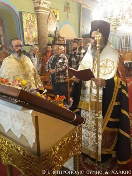 Το πρωί του Σαββάτου, ο Σεβασμιώτατος χοροστάτησε του Όρθρου και τέλεσε την Θ. Λειτουργία ενώ κήρυξε το Θείο λόγο και πάλι στον Άγιο Νικόλαο, με συλλειτουργούς του τους ως άνω κληρικούς. Προ της απολύσεως προέστη του εξαμήνου Μνημοσύνου της μακαριστής Πλουμής Πατρού, μητρός του Πανοσιολ. Καθηγουμένου π. Αντωνίου Πατρού, με την συμμετοχή του Δημάρχου Χάλκης κ. Ευαγγ. Φραγκάκη και πολλών κατοίκων.