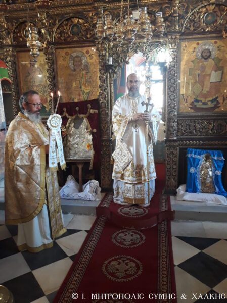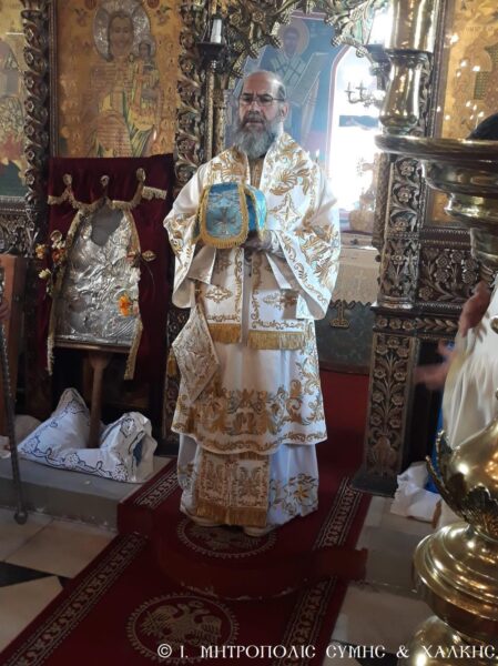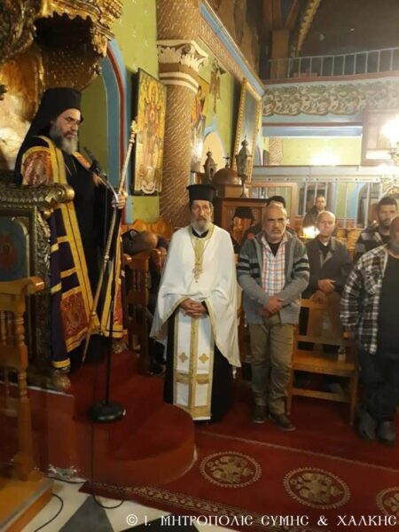 Τον Σεβασμιώτατο συνόδευσε ο Πανοσιολογιότατος Αρχιμανδρίτης π. Αντώνιος Πατρός, Ηγούμενος της Ι. Μονής Πανορμίτου, ο οποίος κατάγεται από την Χάλκη και ο κ. Εμμανουήλ Κυπριώτης, Ιεροψάλτης, ο οποίος και διακόνησε το αναλόγιον στις ιερές Ακολουθίες που έλαβαν χώρα.