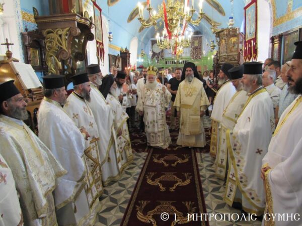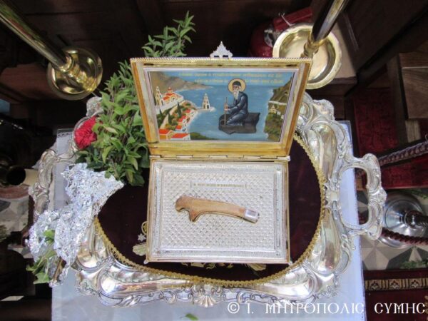 Μετά τήν ἀπόλυση σ’ ὅλους τούς πιστούς πού κατέκλυσαν μέσα καί ἔξω τόν παλαίφατο Ναό τοῦ Ἁγίου Γεωργίου, ἔδωσε ὡς εὐλογία εἰκονίδιο τοῦ Ὁσίου καί παράλληλα εἰδικά γιά τήν περίπτωση Ἐνθύμιο – Δίπτυχο κατασκευασμένο μέ τήν φροντίδα τοῦ Σεβ. Ποιμενάρχου μας κ. Χρυσοστόμου.