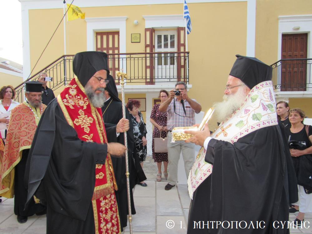 Τό ἀπόγευμα τοῦ Σαββάτου καὶ ὥρα 18:30 ἔγινε ἡ ἐπίσημη ὑποδοχὴ τοῦ Ἱεροῦ Λειψάνου στόν Ἱ. Μητροπολιτικὸ Ναὸ τοῦ Τιμίου Προδρόμου Σύμης καί εὐθύς ἀκολούθησε ὁ Μέγας πανηγυρικὸς Ἑσπερινός, χοροστατοῦντος τοῦ Σεβ. Μητροπολίτου Ἱεραπύτνης καὶ Σητείας κ. Κυρίλλου. Ὁ Σεβ. κ. Κύριλλος συνοδευόταν ἀπό τόν Πανοσ. Ἡγούμενο τῆς Ἱ. Μονῆς Τιμίου Προδρόμου Καψᾶ Ἀρχιμ. Μεθόδιο Περάκη καί τούς Ἱερεῖς π. Ἀντώνιο Τσαγκαράκη καί π. Νικόλαο Ἀλεξάκη. Στήν ὑποδοχή παρέστη πλῆθος πιστῶν μέ ἐπικεφαλῆς τόν Δήμαρχο Σύμης κ. Ἐλευθέριο Παπακαλοδούκα, τούς Ἀντιδημάρχους, τήν Πρόεδρο τοῦ Δημοτ. Συμβουλίου, ἐκπροσώπους τῶν Στρατιωτικῶν καί λοιπῶν Ἀρχῶν, καθώς καί ὁ Ἄρχων Μαΐστωρ τοῦ Οἰκουμενικοῦ Πατριαρχείου κ. Θεοδόσιος Κολιάδης.