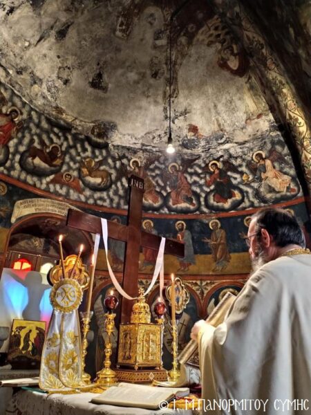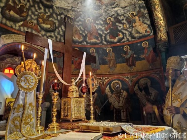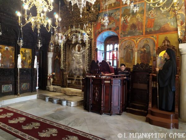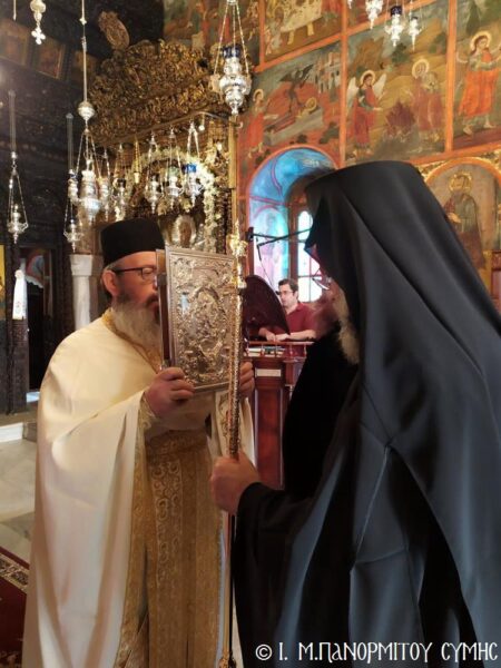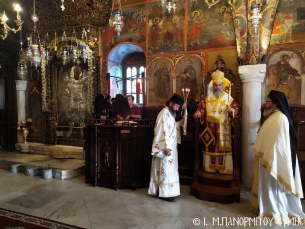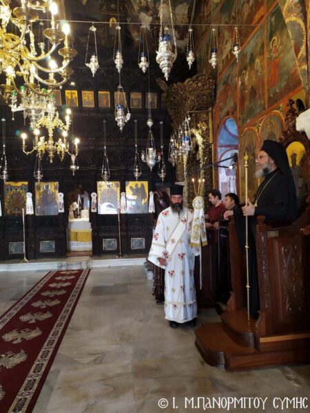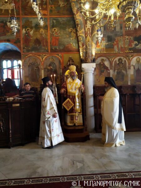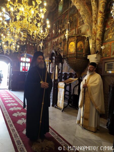 Ο Σεβασμιώτατος είχε συλλειτουργούς του τόν Καθηγούμενο π. Ἀντώνιο Πατρό καί τόν Διάκονο π. Γεώργιο Κακακιό ενώ τελέστηκε κεκλεισμένων των θυρών σύμφωνα με τα μέτρα της ελληνικής πολιτείας.