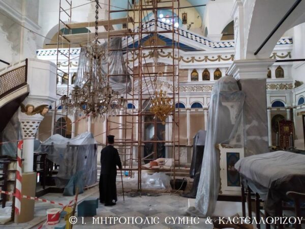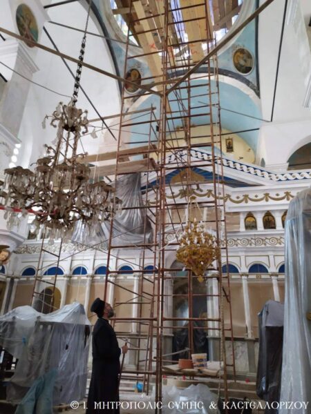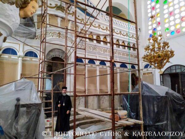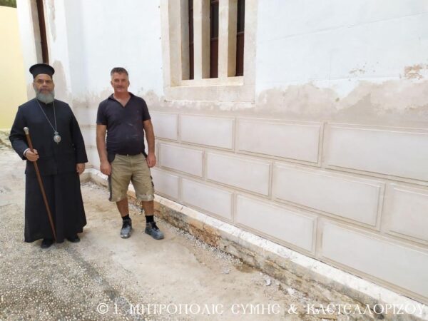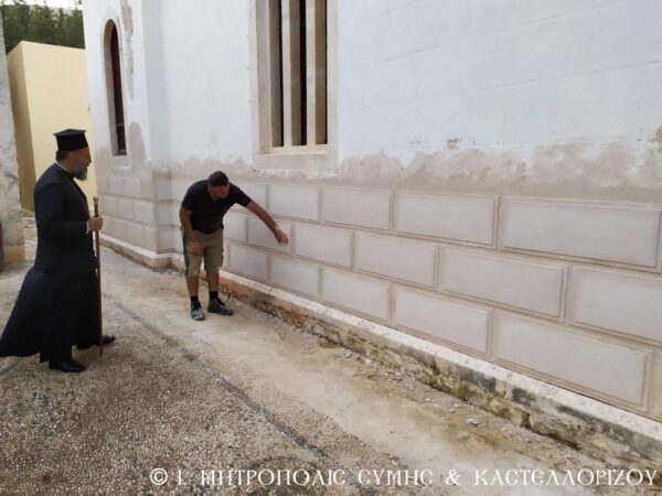 Τέλος, δραττόμενος της ευκαιρίας, ο Σεβασμιώτατος επιθεώρησε και τις εν εξελίξει ανακαινιστικές εργασίες μεγάλης κλίμακας του Ι. Ναού Αγίου Γεωργίου «Πηγαδιού», οι οποίες σημειωτέον υλοποιούνται σταδιακά και όταν επιτρέπει το υστέρημα της αγάπης και προσφοράς των ευλαβών Χριστιανών, ώστε ο καλλιμάρμαρος αυτός Ι. Ναός να διασωθεί εκ της ερειπώσεως, προκειμένου να συνεχίσει επί πολλά ακόμα έτη να κοσμεί το λιμάνι του ακριτικού Νησιού και με τον ήχο των κωδώνων του να συγκαλεί τους ευλαβείς Χριστιανούς στις τελούμενες Ιερές Ακολουθίες.