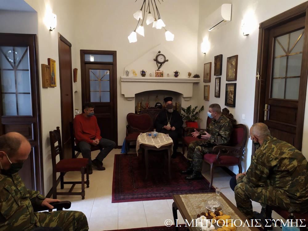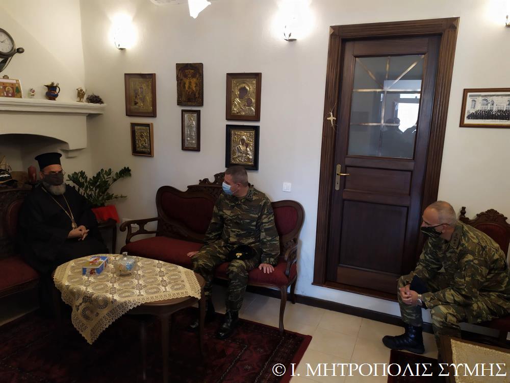 Την Κυριακή 20η Δεκεμβρίου 2020, ο Σεβ. Μητροπολίτης Σύμης κ. Χρυσόστομος, πλαισιούμενος από τον Δήμαρχο κ. Ελευθ. Παπακαλοδούκα και τις λοιπές τοπικές Αρχές της Σύμης, υπεδέχθη στο Μητροπολιτικό Μέγαρο τον Αρχηγό του Γενικού Επιτελείου Στρατού, Αντιστράτηγο κ. Χαράλαμπο Λαλούση, ο οποίος πραγματοποίησε εθιμοτυπική επίσκεψη στην Σύμη εν όψει της εορτής των Χριστουγέννων και του Αγίου Δωδεκαημέρου, συνοδευόμενος από τον Διοικητή της 95ης Α.Δ.Τ.Ε Υποστράτηγο κ. Δημήτριο Χούπη και τον Διοικητή Δ.Α.Ν. Σύμης. Ο Αρχηγός έγινε δεκτός από τον Σεβασμιώτατο με ιδιαίτερη χαρά και αντάλλαξε μαζί του εγκάρδιες ευχές και εόρτια δώρα.