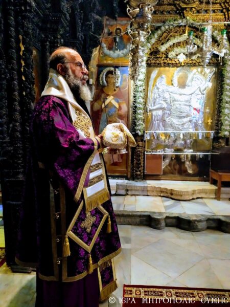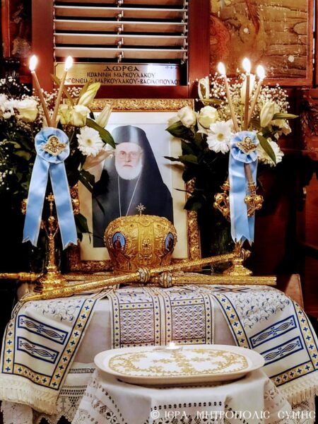 Μετά την Θεία Λειτουργία, ο Σεβασμιώτατος μετά του Ιερού Κλήρου μετέβη εις το παρακείμενον της Ι. Μονής Κοιμητήριον, όπου αναπαύεται το χοικόν σκήνος του αοιδίμου Προκατόχου του, και ετέλεσεν επί του τάφου του το Νεκρώσιμον Τρισάγιον.