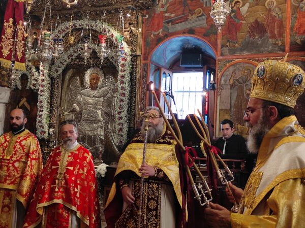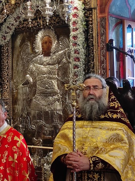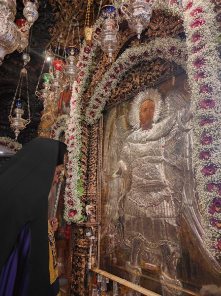 Η Λιτανεία κατέληξε και πάλι στην κεντρική Πύλη, όπου κάτωθεν της Ιεράς Εικόνος του Αρχαγγέλου επί πολλή ώρα διήρχονταν οι πιστοί για να εισέλθουν στην Μονή. Τέλος, εντός του Καθολικού ο Σεβ. Ποιμενάρχης μας κ. Χρυσόστομος ευχαρίστησε όλους τους επωνύμους και ανωνύμους για την παρουσία τους, τον ιερό Κλήρο και τον Λαό για την αγάπη τους και την συμμετοχή τους, τον Ηγούμενο και τα μέλη της Εφορείας της Ιεράς Μονής, τους Ιεροψάλτες, τους Τοπικούς Φορείς και τους πολλούς εθελοντές για την συνεργασία και την βοήθειά τους στην διοργάνωση της Πανηγύρεως.