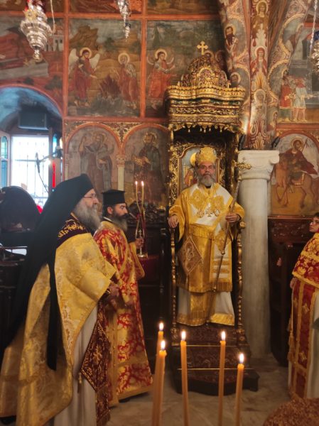 Το πρωί ο Σεβασμιώτατος Μητροπολίτης Σύμης, Τήλου, Χάλκης και Καστελλορίζου κ. Χρυσόστομος χοροστάτησε στον Όρθρο και τέλεσε την Θεία Λειτουργία, με συλλειτουργούς του τον Πανοσιολ. Καθηγούμενο της Ιεράς Πατριαρχικής και Σταυροπηγιακής Μονής Ιβήρων του Αγίου Όρους, Αρχιμ. π. Ναθαναήλ εκ Κω, προσωπικό φίλο και συμμοναστή του, τον Πανοσιολ. Αρχιμ. π. Ιωαννίκιο Αναγνώστου εκ της Ι. Μητροπόλεως Ρόδου, τον Πανοσιολ. Αρχιμ. π. Ιωσήφ Λισγάρη και τον Αιδεσιμ. Πρεσβ. π. Εμμανουήλ Οθίτη εκ της Ι. Μητροπόλεως Λέρου, τον Ιερομόναχο π. Ανδρέα Δημητρίου, τον Αιδεσιμ. Πρεσβ. π. Φιλόθεο Κάλφα και τον Διάκονο π. Γεώργιο Κακακιό.