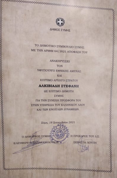 Ο Σεβασμιώτατος Μητροπολίτης Σύμης, Τήλου, Χάλκης και Καστελορίζου κ. Χρυσόστομος παρέστη στην αναγόρευση του πρώην Υφυπουργού Εθνικής Άμυνης κ. Αλκιβιάδη Στεφανη σε επίτιμο Δημότη Σύμης.