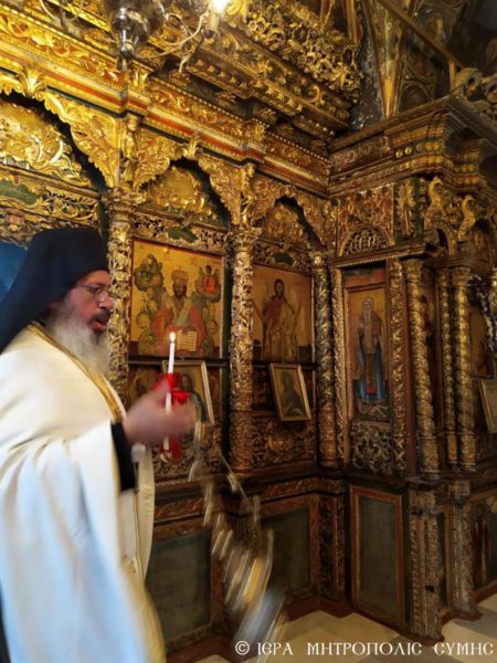 Μετά την Απόλυσιν της Θείας Λειτουργίας, ο Σεβασμιώτατος Μητροπολίτη Σύμης κ. Χρυσόστομο και οι συλλειτουργοί του και το εκκλησίασμα εξήλθαν στο προαύλιο του ιστορικού αυτού Ναού και υπέστειλαν το λάβαρο της Αναστάσεως, το οποίο σύμφωνα με την τοπική παράδοση υψώνεται στο ψηλότερο σημείο του ιστού των Ναών καθ’ όλη την διάρκεια της αναστασίμου περιόδου.