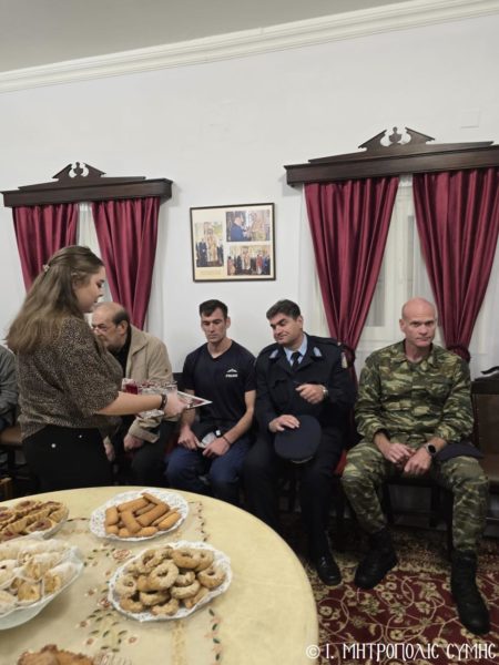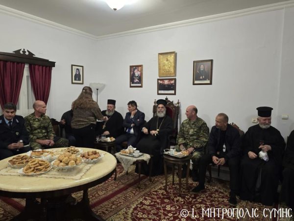Το εσπέρας της Τρίτης 12ης Νοεμβρίου 2024, ετελέσθη ο Μέγας Πανηγυρικός Εσπερινός, χοροστατούντος του Σεβασμιωτάτου, πλαισιουμένου υπό του Ιερού κλήρου της Νήσου μας. Τα δε αναλόγια διακόνησαν γλυκυφθόγγως δεξιά, ο Πρωτοψάλτης του Μητροπολιτικού Ναού κ. Δημοσθένης Γιανναράς και ο Πρωτοψάλτης της Ι. Μονής Πανορμίτου κ. Σταύρος Πήλιουρας και αριστερά οι Ιεροψάλτες κ. Ελευθέριος Ξηράκης, κ. Αγαπητός Μιχελλής μεθ’ ετέρων. Μεταξύ των συμμετεχόντων πιστών, παρέστησαν ο Δήμαρχος Σύμης κ. Ελευθέριος Παπακαλοδούκας μετά του Αντιδημάρχου κ. Νικήτα Γρύλλη, ο Στρατιωτικός Διοικητής Δ.Α.Ν. Σύμης, Συνταγματάρχης κ. Γεώργιος Ζιώγας, ο Διοικητής του 549 Τ.Ε. Σύμης Αντισυνταγματάρχης κ. Στυλιανός Φωκάς, ο Λιμενάρχης Σύμης κ. Σταύρος Μακρής, Εκπρόσωποι της Ελληνικής Αστυνομίας, της ΕΔΟΚ Σύμης, η Πρόεδρος της Ενώσεως Γυναικών Σύμης κ. Σεβαστή Νικόλη και άλλοι εκπρόσωποι τοπικών Φορέων και Συλλόγων. Μετά την απόλυση, οι συμμετέχοντες κληρικοί και λαικοί ανέβηκαν στο παρακείμενο Αρχονταρίκι του Ναού, όπου έκαστος ευχήθη στον εορτάζοντα Μητροπολίτη μας και εδέχθη τα εόρτια κεράσματα.