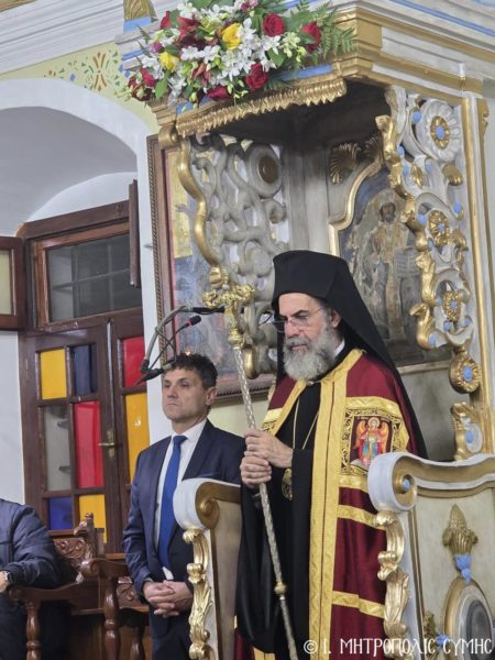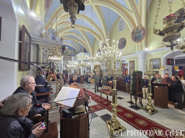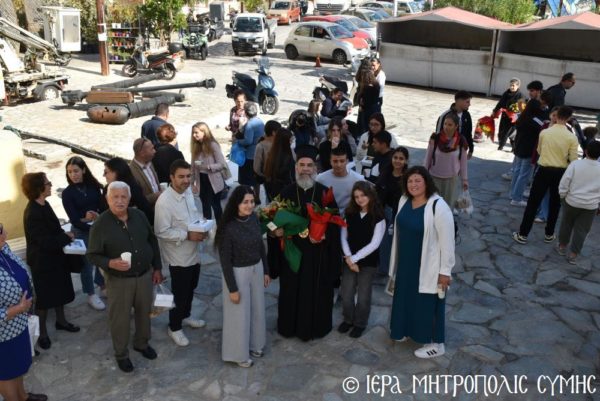 Το εσπέρας της Τρίτης 12ης Νοεμβρίου 2024, ετελέσθη ο Μέγας Πανηγυρικός Εσπερινός, χοροστατούντος του Σεβασμιωτάτου, πλαισιουμένου υπό του Ιερού κλήρου της Νήσου μας. Τα δε αναλόγια διακόνησαν γλυκυφθόγγως δεξιά, ο Πρωτοψάλτης του Μητροπολιτικού Ναού κ. Δημοσθένης Γιανναράς και ο Πρωτοψάλτης της Ι. Μονής Πανορμίτου κ. Σταύρος Πήλιουρας και αριστερά οι Ιεροψάλτες κ. Ελευθέριος Ξηράκης, κ. Αγαπητός Μιχελλής μεθ’ ετέρων. Μεταξύ των συμμετεχόντων πιστών, παρέστησαν ο Δήμαρχος Σύμης κ. Ελευθέριος Παπακαλοδούκας μετά του Αντιδημάρχου κ. Νικήτα Γρύλλη, ο Στρατιωτικός Διοικητής Δ.Α.Ν. Σύμης, Συνταγματάρχης κ. Γεώργιος Ζιώγας, ο Διοικητής του 549 Τ.Ε. Σύμης Αντισυνταγματάρχης κ. Στυλιανός Φωκάς, ο Λιμενάρχης Σύμης κ. Σταύρος Μακρής, Εκπρόσωποι της Ελληνικής Αστυνομίας, της ΕΔΟΚ Σύμης, η Πρόεδρος της Ενώσεως Γυναικών Σύμης κ. Σεβαστή Νικόλη και άλλοι εκπρόσωποι τοπικών Φορέων και Συλλόγων. Μετά την απόλυση, οι συμμετέχοντες κληρικοί και λαικοί ανέβηκαν στο παρακείμενο Αρχονταρίκι του Ναού, όπου έκαστος ευχήθη στον εορτάζοντα Μητροπολίτη μας και εδέχθη τα εόρτια κεράσματα.