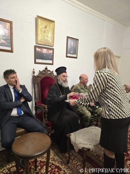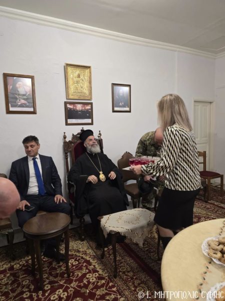 Εν συνεχεία, το πυκνό εκκλησίασμα μετέβη στο Μητροπολιτικό Μέγαρο, όπου ευχήθη και αύθις στον εορτάζοντα Ποιμενάρχη του, δεχόμενο πλούσια δοχή και εόρτια κεράσματα.