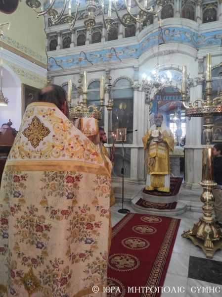 Το εσπέρας του Σαββάτου 12ης Νοεμβρίου 2022, τελέσθηκε ο Μέγας Πανηγυρικός Εσπερινός, χοροστατούντος του Σεβασμιωτάτου, πλαισιουμένου υπό του Ιερού κλήρου της Νήσου μας. Τα δε αναλόγια διακόνησαν γλυκυφθόγγως ο Πρωτοψάλτης του Μητροπολιτικού Ναού κ. Δημοσθένης Γιανναράς και ο Ιεροψάλτης κ. Πανορμίτης Κακακιός μεθ’ ετέρων. Μεταξύ των συμμετεχόντων πιστών, παρέστησαν ο Βουλευτής Δωδεκανήσου κ. Βασίλειος Υψηλάντης και ο Διοικητής της Δ.Α.Ν. Σύμης Συνταγματάρχης κ. Παναγιώτης Βρανάς.