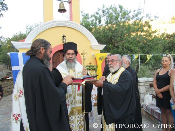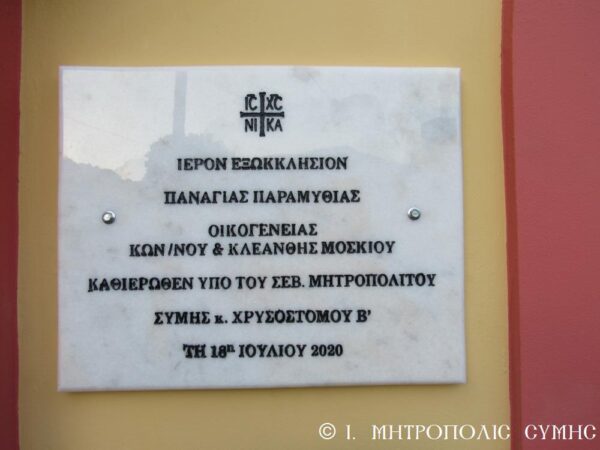 Το Σάββατο το απόγευμα τελέστηκαν τα Θυρανοίξια του Ιερού Εξωκκλησίου της “Παναγίας Παραμυθίας” που το ανήγειραν σε ιδιόκτητο κτήμα στην περιοχή “Ξίσος” στη Σύμη η οικογένεια Κωνσταντίνου και Κλεανθής Μοσκιού. Σημειώνεται δε, ότι πιστό αντίγραφο της θαυματουργού αυτής Εικόνας της Παραμυθίας απέστειλε η Ιερά Μονή Βατοπεδίου στην οικογένεια των Κτητόρων, οι οποίοι κατασκεύασαν τον συγκεκριμένο Ιερό Ναό, την τοποθέτησαν σε κεντρική θέση και έμπροσθεν αυτής εις το εξής καίει ακοίμητη κανδήλα προς δόξαν της Θεομήτορος.