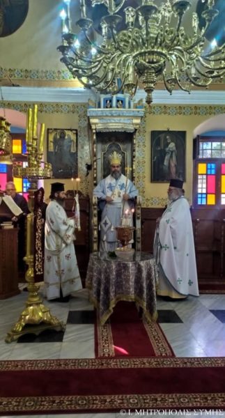 Ο Σεβ. Μητροπολίτης Σύμης κ. Χρυσόστομος χοροστάτησε στον Όρθρο, τέλεσε τον Αγιασμό επί τη ενάρξει του μηνός καθώς και την Θεία Λειτουργία στον Μητροπολιτικό Ι. Ναό Αγίου Ιωάννου Προδρόμου Σύμης, με συλλειτουργούς του τον Εφημέριο και Γεν. Αρχιερατικό Επίτροπο π. Στέφανο Μακρή και τον Διάκονο π. Γεώργιο Κακακιό. Το ι. Αναλόγιο κόσμησαν ο Πρωτοψάλτης του Ναού κ. Δημοσθένης Γιανναράς και ο Ιεροψάλτης κ. Εμμανουήλ Κυπριώτης μεθ’ ετέρων.