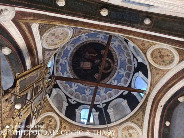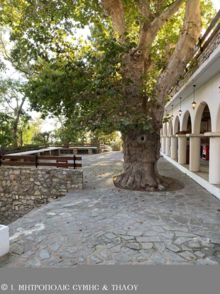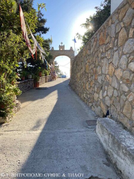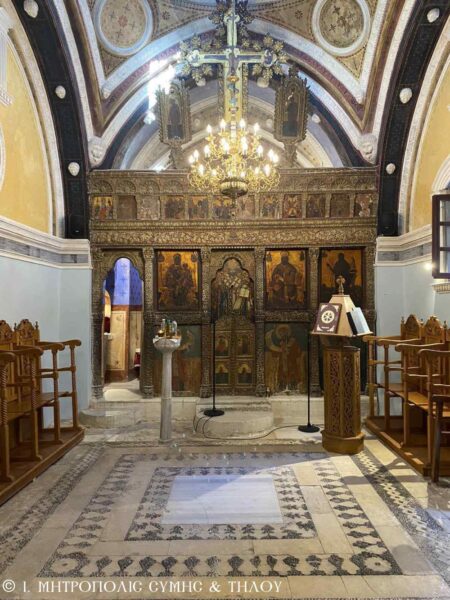 Δραττόμενος της ευκαιρίας, εμνήσθη του αοιδίμου Προκατόχου του, πρώτου Μητροπολίτου Σύμης και Τήλου κυρού Χρυσοστόμου (Δημητριάδη) του Ιμβρίου, με ενέργειες του οποίου παρεχωρήθη προς το Υπουργείο Πολιτισμού οικοπέδο της Μονής, εκτάσεως δύο και πλέον στρεμμάτων περίοπτης μάλιστα θέσεως στην είσοδο του Μεγάλου Χωριού, με σκοπό την ανέγερση του «Διαχρονικού Αρχαιολογικού Μουσείου Τήλου», η οποία ευρίσκεται σε εξέλιξη. Ο μακαριστός Ιεράρχης, έχοντας να αντιμετωπίσει το ανυπέρβλητο ζήτημα της αποκαταστάσεως της αθλίας εικόνας του καταρρέοντος τότε εσωτερικού διακόσμου του Καθολικού της Μονής, έθεσε προσφυέστατα ως απαράβατο όρο της δωρεάς, την εσωτερική ανακαίνισή του, αίτημα το οποίο οι ιθύνοντες της Αρχαιολογικής Υπηρεσίας κατενόησαν, απεδέχθησαν και με έμπρακτο ενδιαφέρον υλοποίησαν, αποπερατώνοντας το έργο σχεδόν προ τριμήνου.