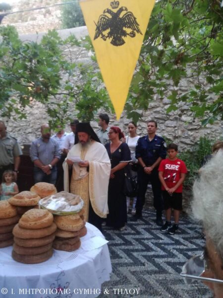Το εσπέρας, στο προσφάτως ανακαινισθέν Καθολικό της Ιεράς Μονής ετελέσθη ο Μέγας Πανηγυρικός Εσπερινός χοροστατούντος του Σεβασμιωτάτου, συμπαραστατουμένου υπό των ως άνω κληρικών και με την συμμετοχή της Δημάρχου Τήλου κ. Μαρίας Καμμά, του κ. Εμμανουήλ Χατζηφούντα επικεφαλής της Αξιωμ. Αντιπολιτεύσεως, ετέρων Δημοτικών Συμβούλων, των λοιπών Στρατιωτικών, Αστυνομικών και Λιμενικών Αρχών, ως και πολλών φιλαγίων Χριστιανών, ενώ προ της Απολύσεως ετελέσθη η Αρτοκλασία στον χαλικόστρωτο εξωτερικό περίβολο της Μονής, έμπροσθεν της αειρρόου Πηγής του Αγίου.