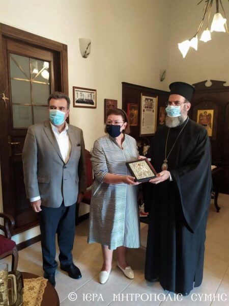 Την Υπουργό Πολιτισμού κ. Λίνα Μενδώνη υποδέχτηκε στα Γραφεία της Ιεράς Μητροπόλεως Σύμης ο Σεβασμιώτατος Μητροπολίτης κ. Χρυσόστομος σήμερα το πρωί, Παρασκευή 18 Σεπτεμβρίου 2020. Η υπουργός συνοδευόταν από τον υφυπουργό Τουρισμού και Βουλευτή Δωδεκανήσου κ. Μάνο Κόνσολο και την Έφορο Αρχαιοτήτων Δωδεκανήσου κ. Μαρία Μιχαηλίδου και με διακεκριμένους συνεργάτες της.