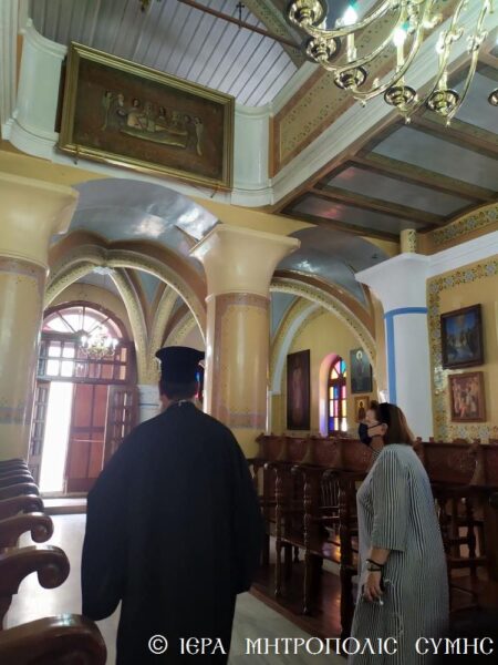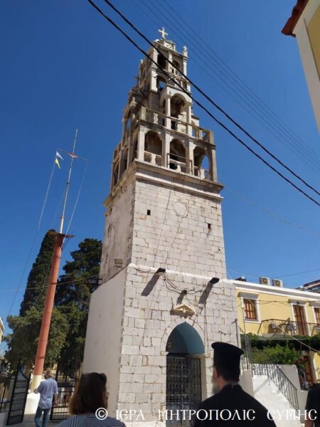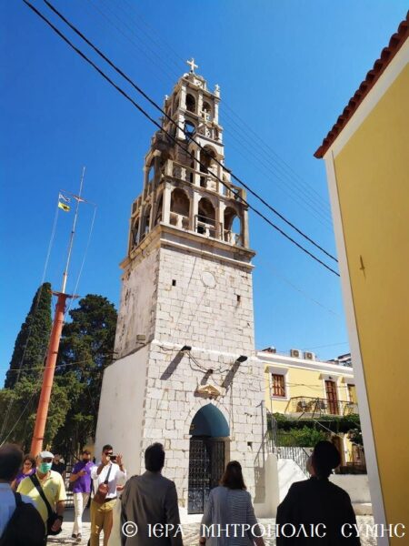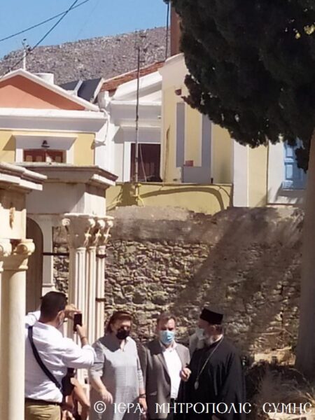 Η κ. Υπουργός επισκέφθηκε την Σύμη, προκειμένου να εγκαινιάσει το απόγευμα την επανέκθεση του Αρχαιολογικού Μουσείου της Νήσου και δραττομένη της ευκαιρίας συζήτησαν με τον Σεβασμιώτατο ουσιαστικά θέματα κοινού ενδιαφέροντος, τα οποία ο Μητροπολίτης παρουσίασε διεξοδικώς, με πρώτιστο το ζήτημα της μεγάλης επικινδυνότητος του Κωδωνοστασίου του Μητροπολιτικού Ιερού Ναού Αγίου Ιωάννου Σύμης. Η κ. Μενδώνη έδειξε μεγάλο ενδιαφέρον και από κοινού πραγματοποίησαν με τον Σεβασμιώτατο επιτόπια επίσκεψη στο μνημείο, για να εκτιμήσει και η ιδία το μέγεθος του προβλήματος και να διερευνήσει ακολούθως τρόπους υλοποιήσεως της από ετών εγκεκριμένης επί τούτω Αρχιτεκτονικής Μελέτης.