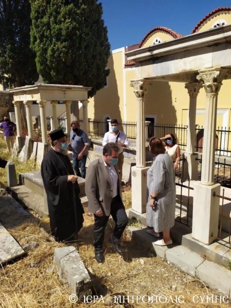 Ακολούθως μετέβησαν και στο παρακείμενο Παλαιό Κοιμητήριο του Μητροπολιτικού Ναού, όπου επιτόπου συζήτησαν τρόπους αποκαταστάσεως και αναδείξεως του ιστορικού αυτού χώρου και η κ. Υπουργός επέδειξε επίσης μεγάλο ενδιαφέρον, προτείνοντας τρόπους στην κατεύθυνση αυτή.