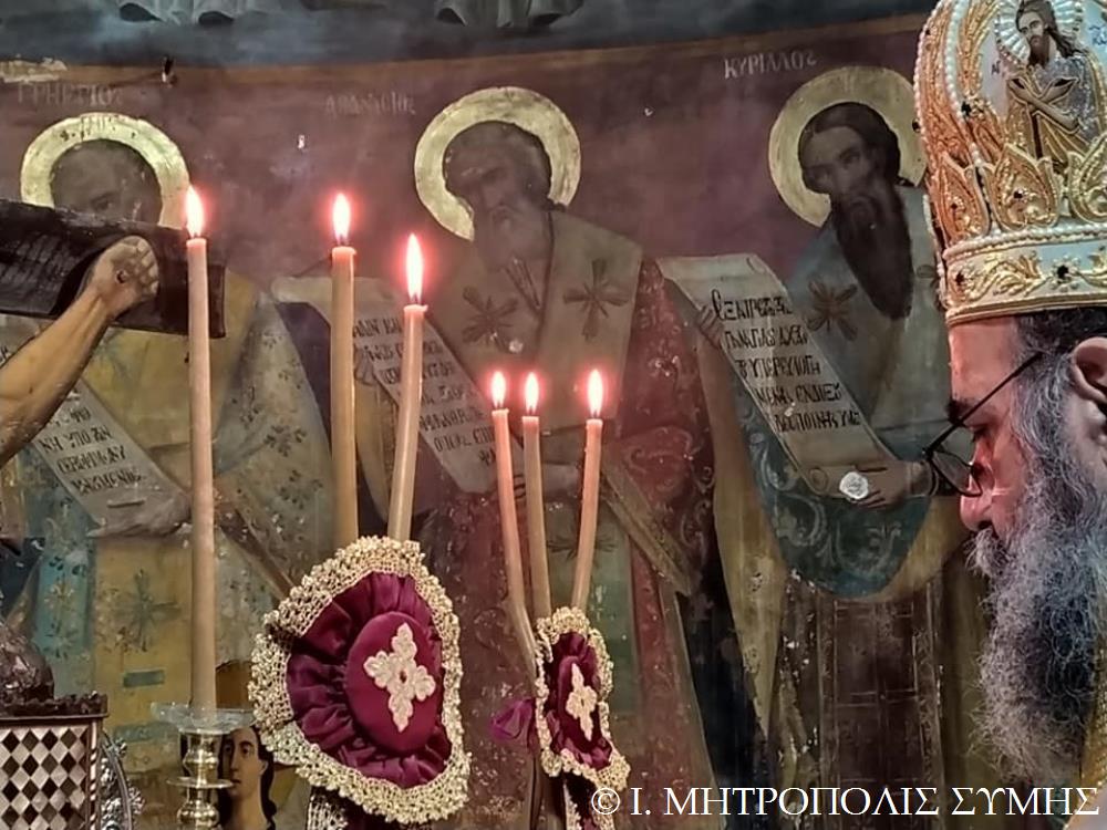 Σήμερα 21η Μαρτίου 2021, Α΄ Κυριακή τῶν Νηστειῶν, ἑορτάστηκε μέ σεμνοπρέπεια καί τήν δέουσα λαμπρότητα στήν Ἱερά Μητρόπολή μας ἡ Κυριακή τῆς Ὀρθοδοξίας, μέ ἐπίκεντρο τόν Ἐνοριακό Ἱ. Ναό Ἁγίου Νικολάου Ἄνω Χώρας Σύμης, προεξάρχοντος τοῦ Σεβ. Μητροπολίτου μας κ. Χρυσοστόμου καί συλλειτουργούντων τοῦ π. Ἐλευθερίου Ὀθίτη καί τοῦ Διακόνου μας π. Γεωργίου Κακακιοῦ. Ἀφοῦ ἐτελέσθη πανηγυρικῶς ὁ Ὄρθρος τῆς ἑορτῆς μέ τά θεόπνευστα ὑμνογραφήματα τῶν Ἁγίων Πατέρων, πού ἀπέδωσαν μελωδικότατα οἱ Ἱεροψάλτες κ Γεώργιος Μοσκιός, κ Παναγιώτης Μητροπάνος, κ. Μερκούριος Γιανναράς καί κ. Ἐμμανουήλ Κυπριώτης, ἀκολούθησε ἡ τέλεσις τῆς Θείας Λειτουργίας τοῦ Μεγάλου Βασιλείου ἱερουργοῦντος τοῦ Σεβ. Ποιμενάρχου μας, ὁ ὁποῖος ἐπικαίρως κήρυξε καί τόν θεῖον λόγον. Μετά τήν ἀπόλυσιν ὁ Σεβασμιώτατος ἀνέγνωσε τό Μέγα Συνοδικόν τῆς Ὀρθοδοξίας καί ἐψάλη τό Μέγα Προκείμενον, “Τίς Θεός Μέγας…”.