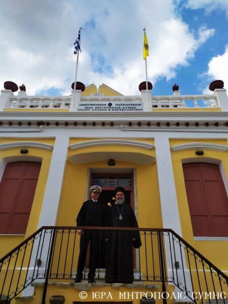 Τον Αρχηγό του Λιμενικού Σώματος-Ελληνικής Ακτοφυλακής, Αντιναύαρχο Λ.Σ. κ. Θεόδωρο Κλιάρη υπεδέχθη ο Σεβ. Μητροπολίτης κ. Χρυσόστομος στο Μητροπολιτικό Μέγαρο. Ο Αρχηγός επί τη αναλήψει των καθηκόντων του, πραγματοποίησε εθιμοτυπική επίσκεψη στην Σύμη, συνοδευόμενος από τον επικεφαλής της Υπηρεσίας Ολοκληρωμένης Θαλάσσιας Επιτήρησης του Α.Λ.Σ.-ΕΛ.ΑΚΤ. Αντιπλοίαρχο Λ.Σ. κ. Γεώργιο Χριστιανό, τον Περιφερειακό Διοικητή της 8ης Περιφερειακής Διοικήσεως Λιμενικού Σώματος – Ελληνικής Ακτοφυλακής Αρχιπλοίαρχο Λ.Σ. κ. Ιωάννη Αργυράκη, καθώς και τον Λιμενάρχη Σύμης κ. Παντελή Μισσό και την Υπολιμενάρχη.