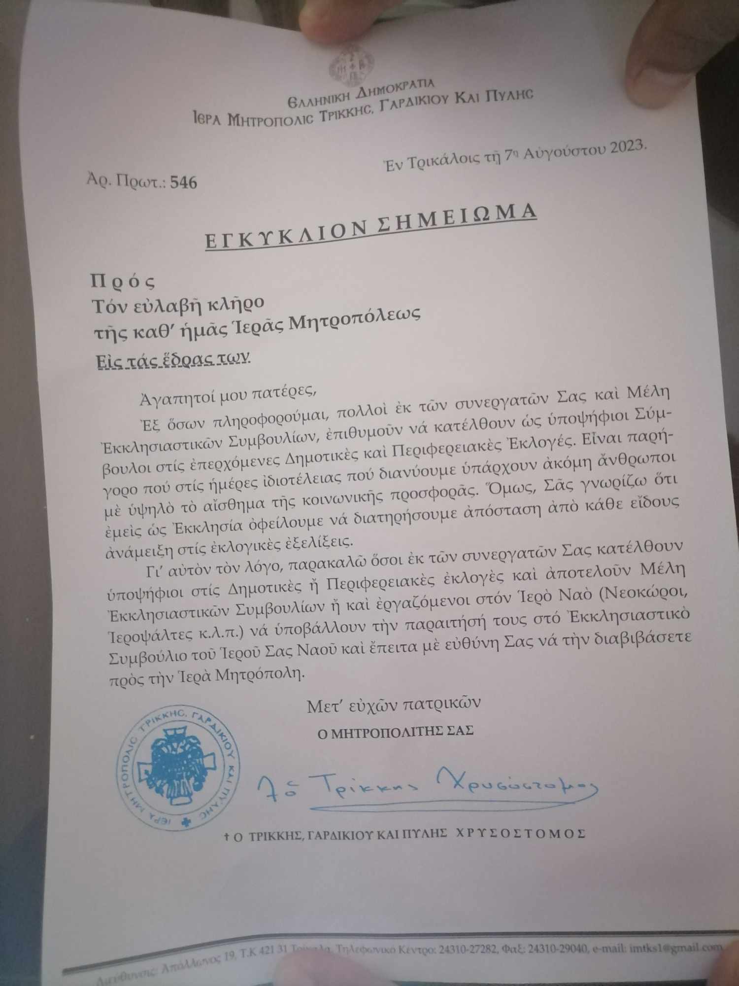 Γι’ αυτόν τον λόγο, παρακαλώ όσοι εκ των συνεργατών Σας κατέλθουν υποψήφιοι στις Δημοτικές ή Περιφερειακές εκλογές και αποτελούν Μέλη Εκκλησιαστικών Συμβουλίων ή και Εργαζόμενοι στον Ιερό Ναό ( Νεοκώροι, Ιεροψάλτες κ.λπ.) να υποβάλλουν την παραίτησή τους στο Εκκλησιαστικό Συμβούλιο του Ιερού Σας Ναού και έπειτα με ευθύνη Σας να την διαβιβάσετε προς την Ιερά Μητρόπολη».