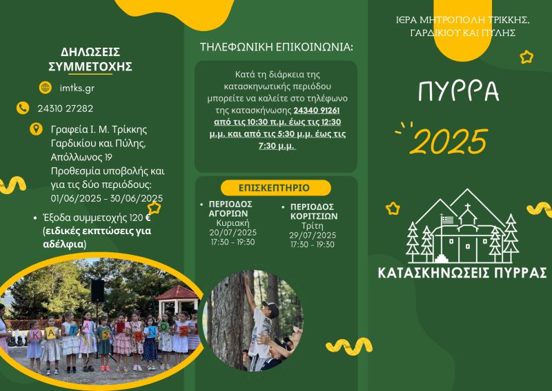Στην πανέμορφη καταπράσινη περιοχή της Πύρρας, εξήντα χιλιόμετρα από την πόλη των Τρικάλων και σε υψόμετρο 1.200 μέτρων εδώ και πενήντα επτά ολόκληρα χρόνια λειτουργούν ανελλιπώς οι Μαθητικές κατασκηνώσεις της Ιεράς Μητροπόλεως Τρίκκης, Γαρδικίου και Πύλης όπου κάθε καλοκαίρι αγόρια και κορίτσια περνούν μέρες ξεγνοιασιάς σε ένα πανέμορφο περιβάλλον.