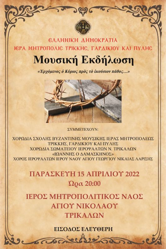 Η Ιερά Μητρόπολη Τρίκκης, Γαρδικίου και Πύλης διοργανώνει μουσική εκδήλωση με τίτλο: «Ερχόμενος ο Κύριος προς το εκούσιον πάθος…» η οποία θα πραγματοποιηθεί αύριο Παρασκευή 15 Απριλίου 2022, στις 22:00, στον Ιερό Μητροπολιτικό Ναό Αγίου Νικολάου Τρικάλων.