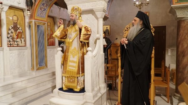 Με λαμπρότητα εορτάστηκε η μνήμη του Αγίου Ιωάννου του Χρυσοστόμου, αν και κεκλεισμένων των θυρών χωρίς την παρουσία πιστών με Πανηγυρική Αρχιερατική Ιερά Αγρυπνία που τελέσθηκε στον Ιερό Προσκυνηματικό Ναό Αγίου Βησσαρίωνος Τρικάλων την Πέμπτη 12 Νοεμβρίου 2020. Ο Σεβασμιώτατος Μητροπολίτης Τρίκκης και Σταγών κ. Χρυσόστομος χοροστάτησε στις Ακολουθίες του Εσπερινού και του Όρθρο και στην συνέχεια τέλεσε την πανηγυρική Θεία Λειτουργία συλλειτουργούντων του Πρωτοσυγκέλλου της Ιεράς Μητροπόλεως Πανοσιολογιωτάτου Αρχιμανδρίτου Αλεξίου Κανίνα και του Ιεροκήρυκος Πανοσιολογιωτάτου Αρχιμανδρίτου Αχιλλίου Τσούτσουρα. Συμπροσευχόμενος παρέστη ο Σεβασμιώτατος Μητροπολίτης Σταγών και Μετεώρων κ. Θεόκλητος.