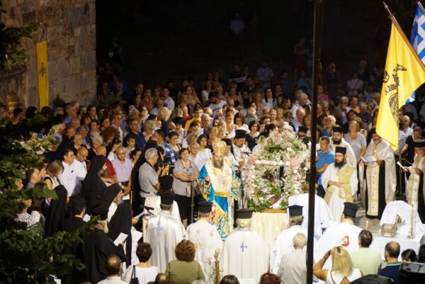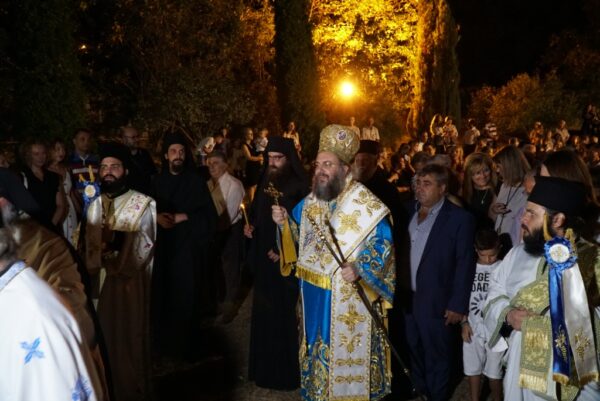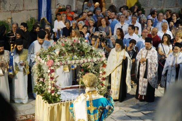 Μετά το πέρας του Εσπερινού ο Ποιμενάρχης ηγήθηκε της λιτανεύσεως του Επιταφίου του Θεομητορικού σώματος πέριξ του Ιερού Ναού και εν συνεχεία εψάλλησαν τα Εγκώμια της Θεοτόκου.
