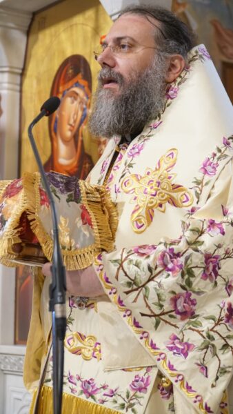 Τούτη τὴν ἱερὴ στιγμὴ ἐκφράζω τὴν βαθύτατη εὐγνωμοσύνη καὶ τὸν υἱικὸ σεβασμό μου στὸ σεπτὸ ἱεράρχη καὶ Γέροντά μας Μητροπολίτη Ἀλέξιο, ὁ ὁποῖος δημιούργησε σιωπηρῶς καὶ μὲ ἀρίστη ποιμαντικὴ μέριμνα τίς προϋποθέσεις, ὥστε ἐμεὶς οἱ νεώτεροι νά ἀπολαμβάνουμε τοὺς καρποὺς τῶν πνευματικῶν του κόπων, καθὼς σήμερα λειτουργοῦμε στόν Ἱερὸ Ναὸ τοῦ Ἁγίου Βησσαρίωνος ποῦ μὲ δικὲς του ἐναγώνιες προσπάθειες ἀνηγέρθη στό κέντρο τῆς πόλεως μας.