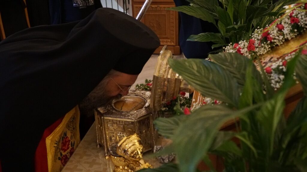 Στον πανηγυρικό αρχιερατικό εσπερινό της εορτής χοροστάτησε ο Σεβασμιώτατος Μητροπολίτης Τρίκκης και Σταγών κ. Χρυσόστομος, ο οποίος την Πέμπτη 21 Μαΐου το απόγευμα υποδέχθηκε την Τιμία Κάρα στα Προπύλαια του Ιερού Ναού και την οποία εκόμισε από την Ιερά Μονή Δουσίκου όπου και φυλάσεται, ο Πανοσιολογιώτατος Αρχιμανδρίτης Βησσαρίων Δουσικιώτης.