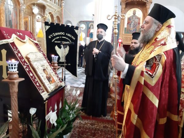 Με τη δέουσα θρησκευτική κατάνυξη και μεγαλοπρέπεια υποδέχθηκε έμπροσθεν του Ιερού Ναού Αγίου Βησσαρίωνος Πύλης Τρικάλων την Ιερά Εικόνα ο Σεβασμιώτατος Μητροπολίτης Τρίκκης, Γαρδικίου και Πύλης κ. Χρυσόστομος και εν συνεχεία τοποθετήθηκε εντός του Ιερού Ναού.