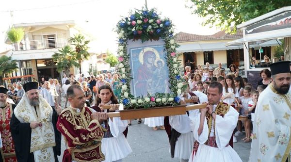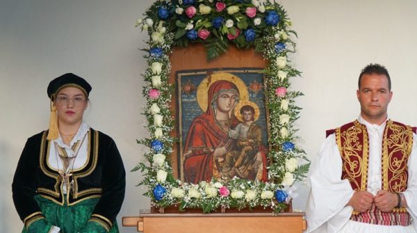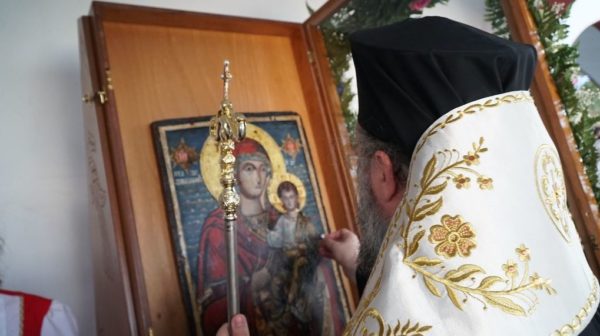 Την Ιερά Εικόνα της Παναγίας κόμισαν φουστανελοφόροι. Με την άφιξη την Ιεράς Εικόνος στον Ιερό Ναό τελέσθηκε η επίσημος Δοξολογία και ο Μέγας Πανηγυρικός Εσπερινός Χοροστατούντος του Σεβασμιωτάτου.