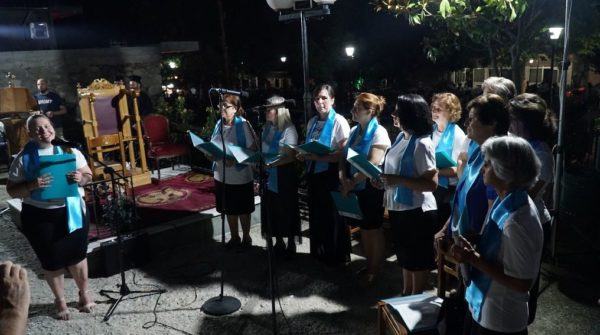 Μέτα το πέρας του Εσπερινού, ο Σεβασμιώτατος κ. Χρυσόστομος, περιχαρής άκουσε στον αύλειο χώρο του Ναού τη νεοσύστατη ενοριακή χορωδία κυριών να τραγουδά παραδοσιακά άσματα.
