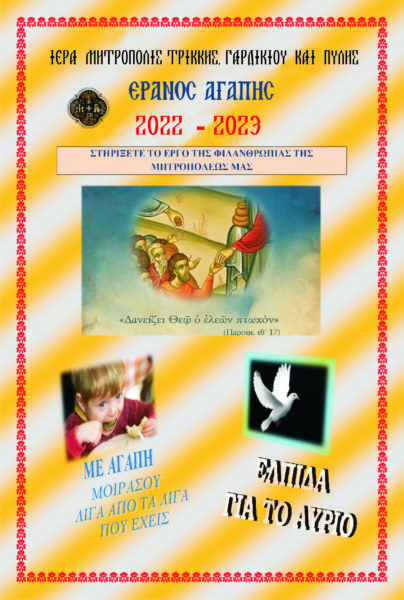 Ξεκίνησε και θα διαρκέσει έως 18 Ιανουαρίου 2023 στα όρια της κάθε ενορίας ο Έρανος της Αγάπης, με σκοπό να συγκεντρωθούν χρήματα για την ενίσχυση της όλης προσπάθειας για τη στήριξη των ενδεών αδελφών εκάστης ενορίας. Μην κρατήσετε την πόρτα σας κλειστή!